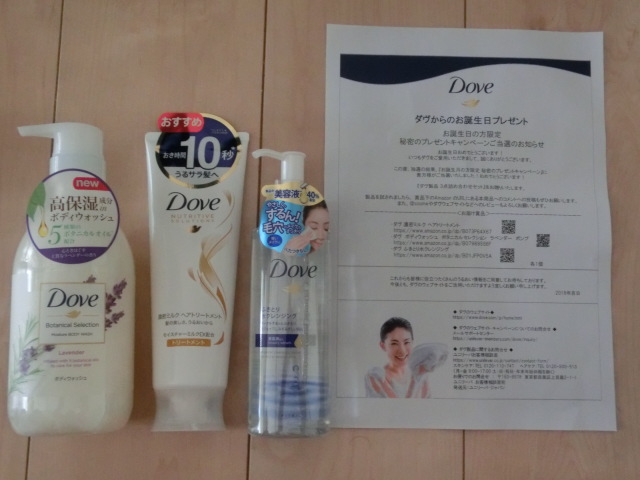 お届け物でサプライズが!Doveの会員サイトで、誕生月のプレゼントキャンペーンで、初めて当選しました。70人だと狭き門かも。コットンで落とすメイク落とし、トリートメント、ボディソープ。安く買えても1500円相当(値段が気になる人)