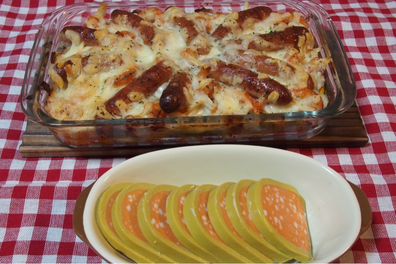 かぼちゃのグラタンをつくりました。トッピングはウィンナーと海老です。今晩のかぼちゃは 雪化粧かぼちゃです。アボガドとサーモンのテリーヌといただきます。