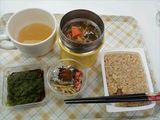 お弁当(梅干し、焼きたらこ)、玄米、めかぶ、脂肪燃焼野菜スープ、和風健康スープ