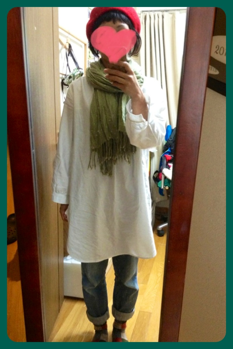 今日のコーデは肌寒いのでさくっとシャツワンピを着ました。 シャツワンピはBshopで購入したsmockのもの。 下のパンツはユニクロのボーイフレンドデニム。 ロールアップして見せてるソックスは靴下屋のもので秋カラー。 ちょっとお買い物に出るときはこないだ買った赤のベレー帽に モスグリーンのストールを巻きました♪ 靴は移してませんがビルケンシュトックのモンタナを合わせます!!