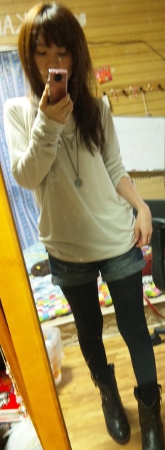今日はちょっと肌寒い気もしたので。 グレーのロンT ショーパン 40デニールのタイツ ブーツ ネックレス...LIP SERVICE この後、外に出たら意外に暑かったので、 七分袖のシャツに着替えましたw