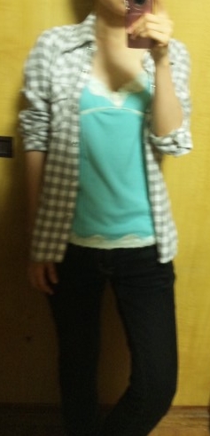 インナー...CHRIF シャツ...DURAS パンツ...ユニクロ インナーのキャミの色が好き。 エメラルドグリーン的な。 レースがついてるので、 全体的にカジュアルすぎずな。