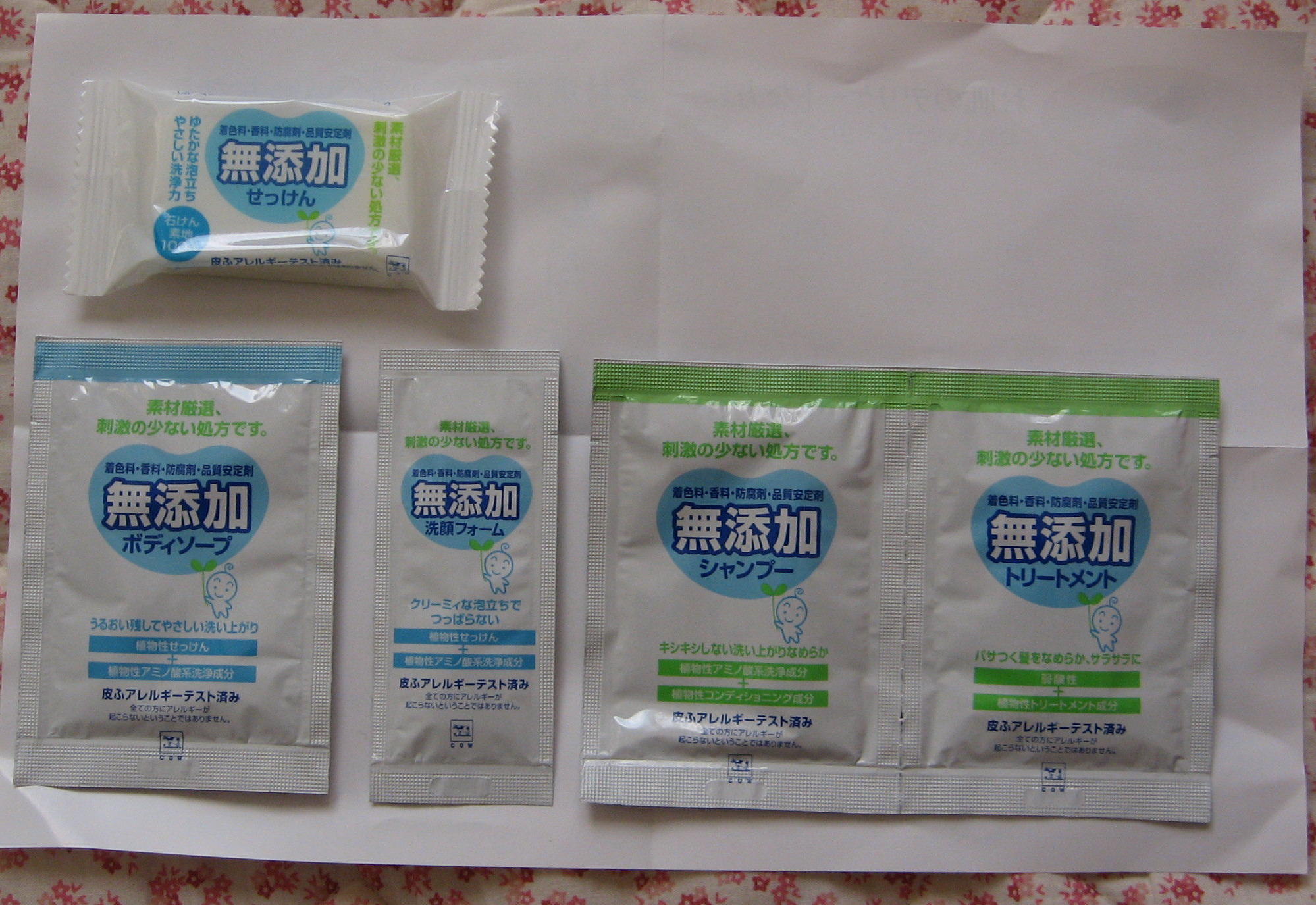 牛乳石けんのブランドの無添加サンプルです。 石けん25g、 洗顔、ボディーソープ、シャンプー、リンス、各1袋 赤ちゃんにも安心して使えますね! 石けんはけっこう長く使えそうです☆
