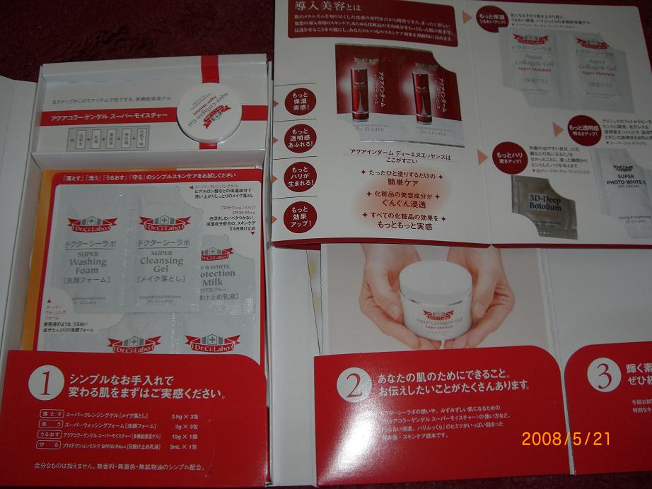 無料と言う事で注文したところサンプルにしては沢山はいってました(^−^) 注目の「アクアコラーゲンスーパーモイスチャーゲル 10g」もたっぷり使えます! 小さな容器が可愛いんです(笑) クレンジングや洗顔も3回分入って、「赤から導入」のうるおい実感サンプルも入っていてお得感たっぷり♪ ゲルは結構コッテリしてて肌には馴染みやすかったかな。 翌日には顔色も白くて乾燥肌&敏感肌の私にも良かったけど値段がお高めなのが(><) しかも使いだして3日目で、少し赤みも出てきて結局あわなかったようで。。。{サン...