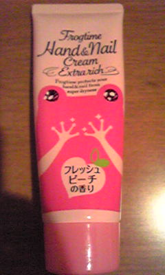 私のお気に入りハンドクリームです☆ カエル柄のカワイイクリーム シアバター・ホホバオイル・セラミド・アミノ酸(保湿成分)たっぷり配合☆ クリームは重い感じですが、手に擦り込むとサラサラになります♪ 香りはフレッシュピーチ☆ お値段は¥700(税抜き) 無香のもあります お試しあれ☆