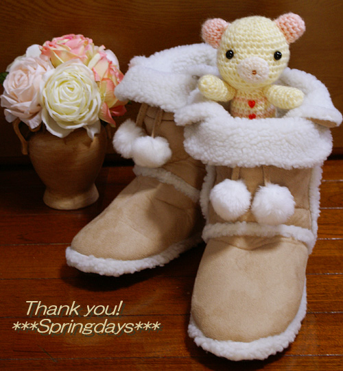 500円でした(安) ネットで購入したのですが、やや薄手で外では履きにくいとのこと。 試しに購入してみたところ、私には十分アタリでした♪ ふわふわで暖かく、現在はあまりに可愛いので室内履きとして 可愛がっているわけなんですけれども お小遣いに余裕ができたら2〜3足余分に買って ちょっと買い物用にも欲しいぐらいです。 だって激安ですもの。そして軽いのがポイント。 よく歩くので、軽いブーツって嬉しいんですよね。 ボンボンが可愛すぎて30代後半にはいかがなものかと思うのですが やっぱり可愛いので履いち...