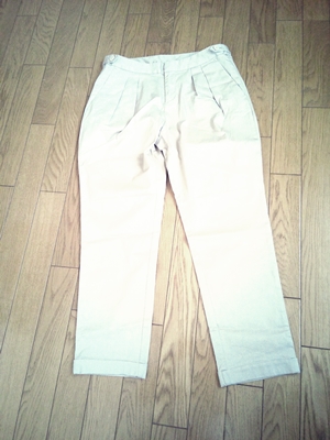 私のバーゲンの戦利品を紹介します^^ GUで980円で購入したテーパードパンツです。 ベージュのパンツは前から狙っていて、 ユニクロで安くなったところを買おう!と思っていたところ、GUで 手ごろな価格で発見してしまったので買っちゃいました☆ テーパードパンツなので、腰回りはゆったりしていて、 その対比でウエストがしまっているように見えます♪ 暑いときはショート丈のボトムを穿きたくなりますが、 日焼けが気になっちゃうので、こういうパンツアイテムは めちゃめちゃ使えます。