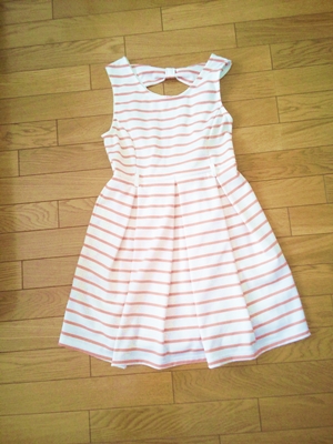 私のバーゲンの戦利品を紹介します^^ HONEYSで980円で購入した赤ボーダーのワンピースです。 バックはリボンで可愛い装飾になっています。 フレアタイプで膝丈なので、上品な女の子、という雰囲気です。 夏はそのまま着る勇気がないので、カーディガンを羽織るなど しています。 春・夏・秋・冬と着まわせられる優秀なワンピースですが 素材が重く、どっしりした感じがあります。 ワンピースはどうしてもフェミニンすぎることがありますが、 ボーダーであれば適度なカジュアルダウンができます♪