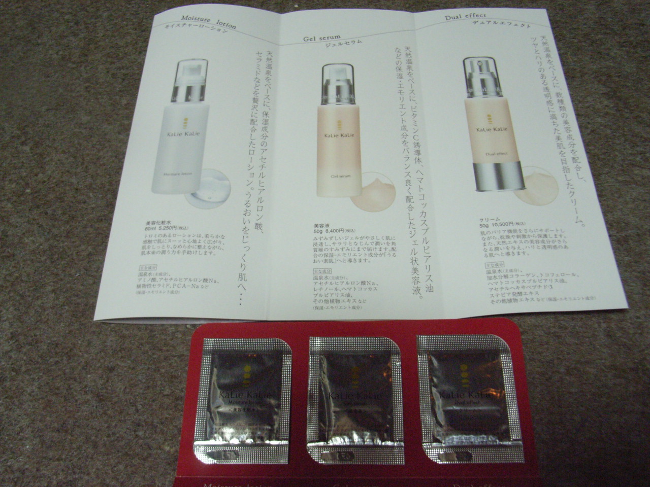 先日、キレイナビ 秋のビューティーパーティに参加した際にいただきました。 KaLie KaLie(カリエカリエ)お試しサンプルです。 美容化粧水、美容液、クリームの3点です。 温泉水が主成分で、美容化粧水はとろみがあるので、 手でつけやすく、美容液はみずみずしく、 クリームは軽い使い心地、付け心地がいいです。 無香料なので、香りが気になる方にもおすすめです。