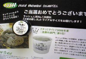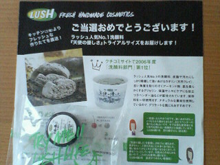 LUSH「天使の優しさ」トライアルサイズ 無料モニター当選しました!! 使用したところ、 汚れが落ちてる感が実感出来、そして、 さっぱりしているのに、しっとりするってかんじで、 とてもいいです。 使い続けたくなりました。。 是非、お試しあれ。