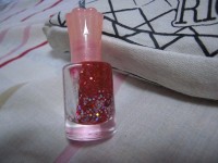 この夏大活躍したアイテムを紹介します! キャン・ドゥで数年前に購入したネイルカラーです。 主にピンク色の下地を爪に塗った後に、 仕上げにこれを爪に塗って、ラメをつけたり、 小さめのスパンコールを付けることでキラキラさせています。 またこのネイルカラー自体も、爪に塗ると少し 赤っぽく発色するので、薄目のカラーのネイルの上から 濃いめにするために塗ることもあります。