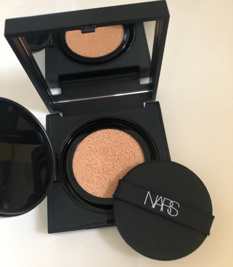 カラーは、5880(ピンクとイエローのバランスのとれた明るめの肌色の方に)を使用しました。 黒く四角いコンパクトケースで、スタイリッシュな印象です。 「NARS」の白い文字が映えます。 ミラーが大きめで使いやすいです。 付属のパフが薄くて、みずみずしいクッションファンデがほどよくついて、お肌にのせやすいです。 薄づきでナチュラルなつけ心地です。 お肌にピタッと密着し、シミや色ムラ、赤み、毛穴の凹凸、ニキビ跡もしっかりカバーしてくれます。 頬の高いところが、上品にツヤッとして素肌感がある仕上がりです。 軽...