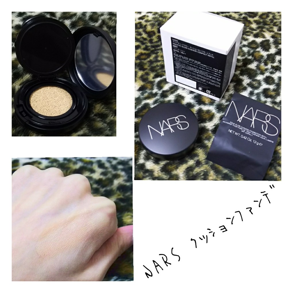 色は、6802でピンクベースの明るい肌色で、キレイな色です。 アジア人の肌の色に合わせた6色展開で、カラーバリエも豊富です。 マットな黒色の丸いコンパクトケースです。 NARSの白いロゴが綺麗です。 白と黒のコントラストが、とっても美しいです。 洗練されたフォルムです。 レフィルのセットも簡単で、すぐにカチッとセットできました。 藍色で、ツルツルしたクッションファンデーション専用のパフです。 薄いパフで、パフをスポンジにポンポン押すと、ファンデーションがみずみずしくつきます。 朱肉のようにジューシーなクッ...