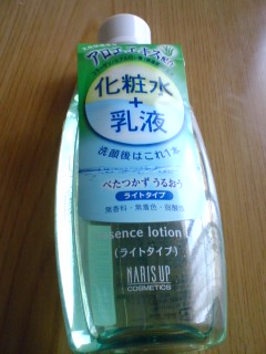 ナリスのクリアモイストエッセンスローションです。 1本で二つの働きがありお手入れが簡単にできます。 化粧水の潤い補充効果と乳液の潤いキープ効果が同時に試せます。 肌に優しいアロエエキス配合でべたつかず、 コラーゲンとヒアルロン酸の力で潤いが続きます。 この露の季節のお肌の手入れにとても便利です。
