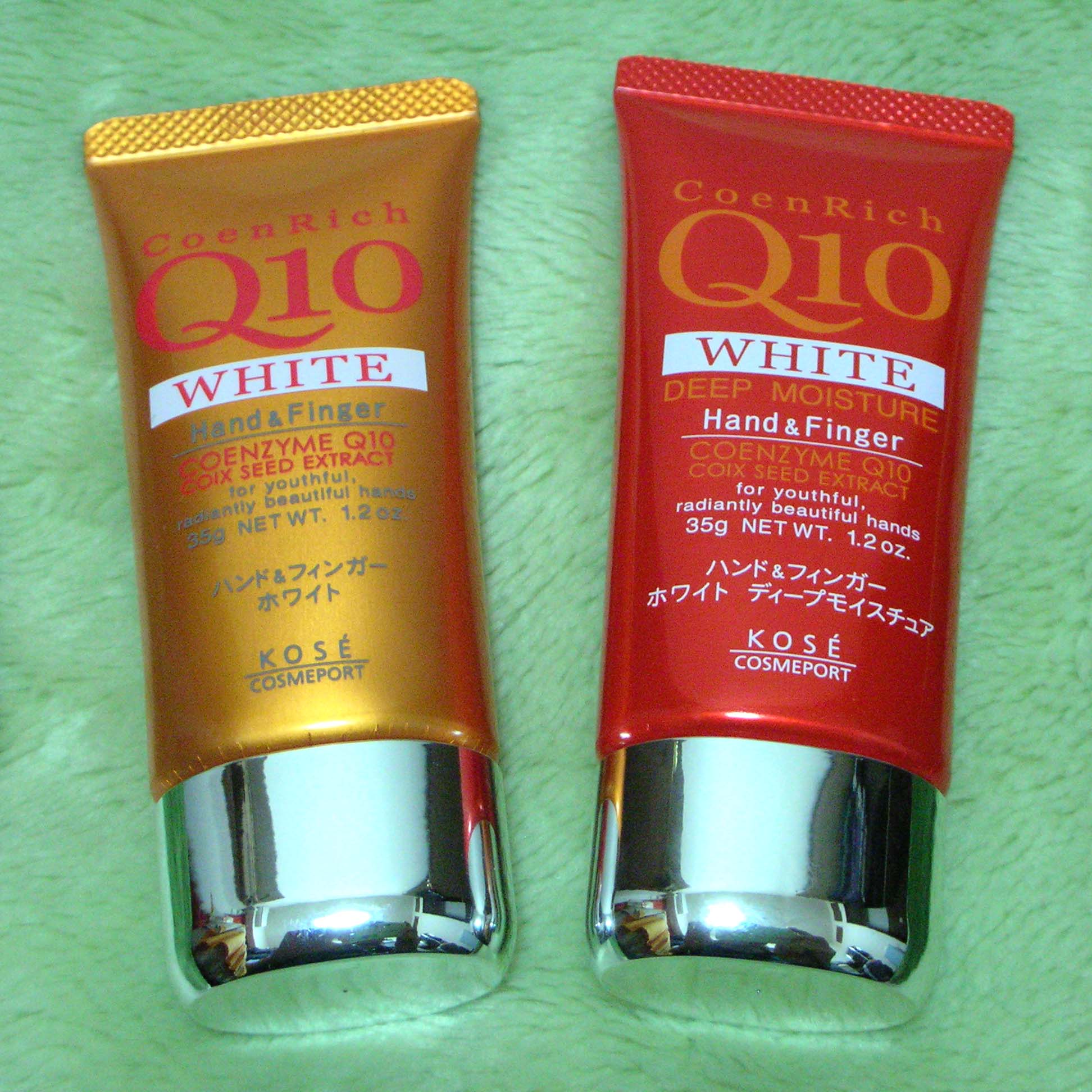 手肌年齢対策用の、Q10ホワイトハンドクリーム2種類です。オレンジの方が美白、赤い方がディープモイスチュアです。 ホワイトハンドクリーム(オレンジ)の方は、伸びもなじみもよく、使い勝手良いと思います。手肌年齢対策というだけあって、ハリが出るようなカンジもします。 ディープモイスチュア(赤)の方は、ハンドクリームにしては固いテクスチャで、全然伸びません(笑)気合入れて伸ばします。でも、ものすごい保湿感です。 この辺は好みの問題かな〜と思いました。あたしは日中と夜とで使い分けてます。