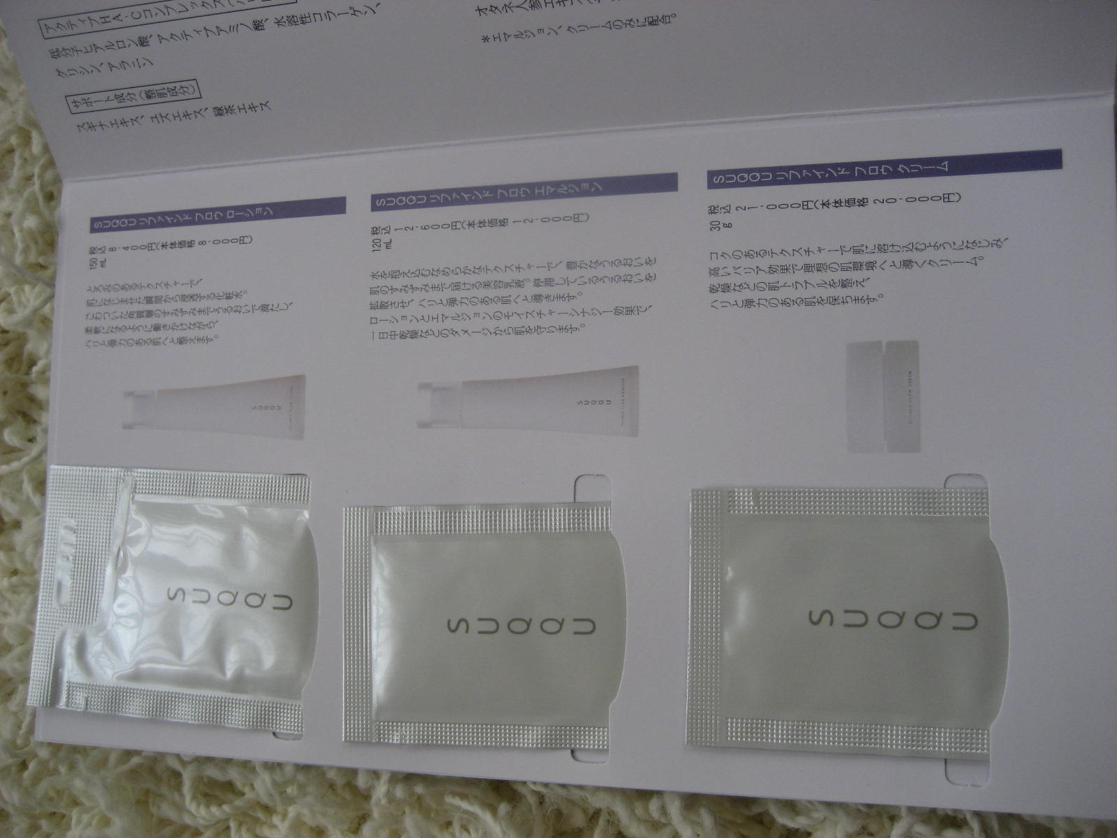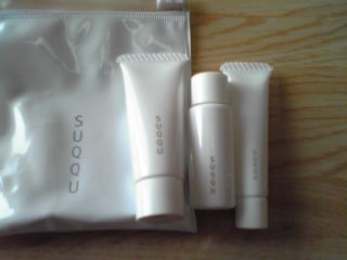 ローション・エッセンス・マスクのミニセットをいただきました。 ローションは石けんのような香りが心地よく、しっとり浸透する感じがしました。 エッセンスは、初期のHAKUのようなとろっとみずみずしい私の大好きなテクスチャーで、使い切ると何となく顔全体が明るくなったような気が・・・☆ (マスクはまだ使っていません) SUQQUは全く初めてだったのですが、白いパッケージも清潔感いっぱいで、これからの季節の紫外線対策にぴったりだと思いました。