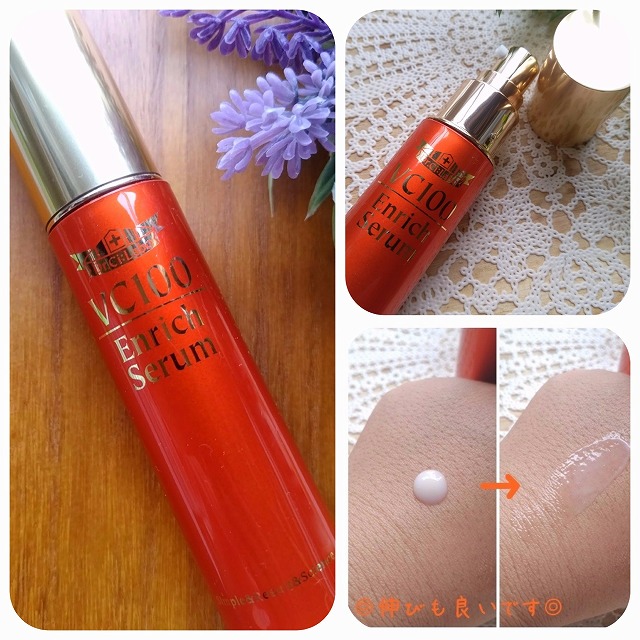 エイジングサインに着目した高濃度美容液でハリ・ツヤ・うるおい のある艶肌にしてくれるVC100エンリッチセラムを使ってみました。 プッシュタイプの容器なので、とても使いやすいです。 肌につけるときグレープフルーツ系の柑橘の香りがするのがいい。 爽やかな香りなのでとても気に入っています。 肌への浸透もよくべたつく感じがないので使いやすいです。 ちょうどいいしっとり感と潤いのある肌になりました。 史上最高濃度の100倍浸透ビタミンC(APPS)配合の美容液で、 フラーレン、プラセンタ、ヒアルロン酸、コラーゲン...