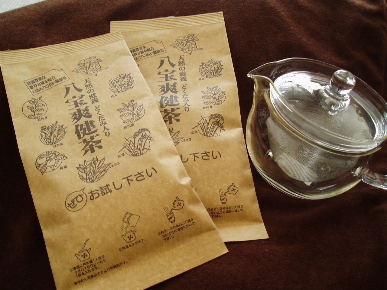 今回は40g×2個、ガラスポット付きで1000円で購入しました。 はと麦・はぶ・プーアール・くまざさ・柿の葉・杜仲茶・玄米・ どくだみが入っています。 栄養価が高く、疲労回復や皮膚の新陳代謝の促進をしてくれて、 シミやにきびなどに効果があるといわれています。 味は飲みにくいと感じることもなく、普通に美味しいお茶です。 体脂肪率が下がった人もいるようなので 私はダイエット目的で飲んでいます♪