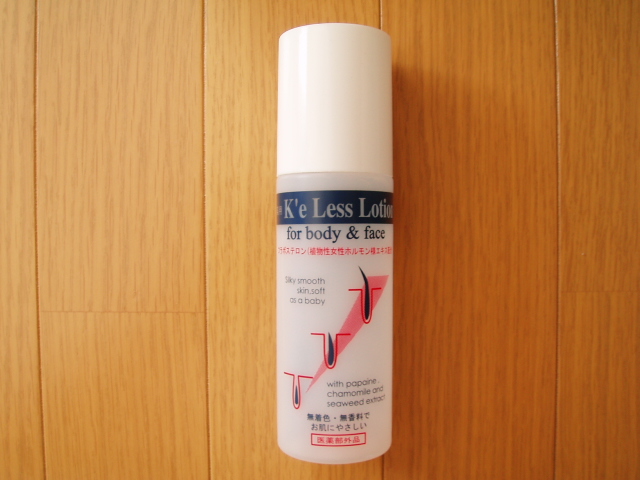 通販で買ったボディケア用品です。 むだ毛を抑制して肌をきれいに健やかに保つローションです。 6個セットでした。 私は毛の処理をした後にマッサージしながら塗りこんでいます。 使用感はいいけど、むだ毛抑制効果はいまいちかな。