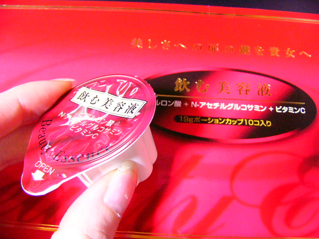ヒアルロン酸のほか、N-アセチルグルコミン酸とビタミンCが配合されています。カップに入っていてのみやすいです。10個いりで定価4200円。甘酸っぱくておいしく、続けやすそうでした。飲み始めて5日目ですが肌がもっちりぷりぷりしてきました。