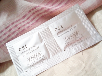わたしの秋のおすすめメイクアイテムを紹介します! サンプルでいただいたエストの日中乳液 ホワイトニングフォース デイエマルジョン βタイプです。 SPF30 PA+++で、保湿を兼ねて、秋の強い紫外線対策に 使える化粧下地です。 美白成分カモミラET配合、複合保湿成分のサーキュレートEG <ユズエキス、褐藻エキス、グリセリン>配合で、乾燥 しがちな肌にもぴったりです。 夕方になってもほとんど乾燥しなかったので、おすすめです!