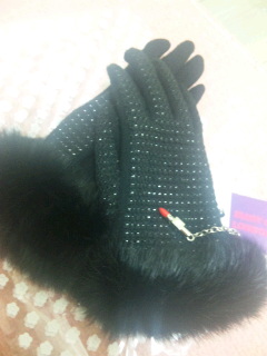 黒い生地にラメが入っている事で地味にならず。ファーもふわふわで手触り最高! この手袋で冬らしいコーディネートになりますよ。リップのチャームが手首についていますが、チェーンが長いのでアクセントにはならず…。手袋をはめる時は外します。 バックにチャームをつけて、手袋を脱いだ時になくさない様にはめておく事が可能です。