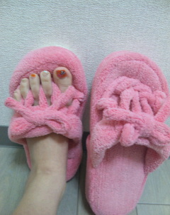 お部屋用スリッパ。 5本指に分かれています。 足の裏をスベスベにしてくれる効果も有り。 フカフカで履き心地も良いです。 ヒールの高い靴が好きなので、帰ってきたらこのスリッパを履いて足のケアをしています。