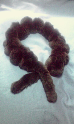 冬はファーの小物に目が行きます♪ こちらは黒いラビットファーのティペットです。 丸いぽんぽんが連なっていて、好みの長さの場所でぽんぽんを片側の紐にくぐらせて留めます。 長さが短いのでマフラーのようにアレンジは楽しめませんが、タートルやアンサンブルの襟元のポイントとして使うとオシャレです。 お嬢さんっぽいっていうのかな?とっても上品な感じに仕上がります。 本物なので滑らかな肌触りで、物凄く暖かいです♪