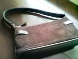 肩から下げられる小さなバッグです。 中に敷居があるので、携帯やカギなどが行方不明にならず使いやすいです。 表の生地は別珍なので、秋冬に使っています。