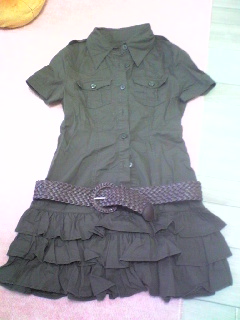 秋色、カーキ色のシャツワンピース。 3段フリルが可愛い☆ 丈は短いですが、レギンスで合わせると気になりません。
