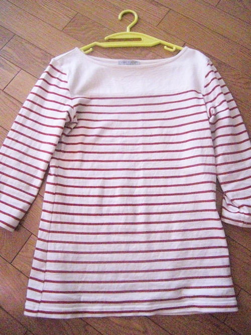 私のバーゲン戦利品を紹介します! しまむらで970円で購入した赤ボーダーのTシャツです。 お店では紺色のボーダーは良く見かけても赤ボーダー がなかなか見つからないので、これを見つけたときにすぐに 購入しました^^ ボート型のネックで鎖骨が綺麗に見えるし、 なにより肩幅を抑えるので華奢に見えます^^ チュニックくらいの丈ですが、私はフレアスカートや パンツにインして使っています。