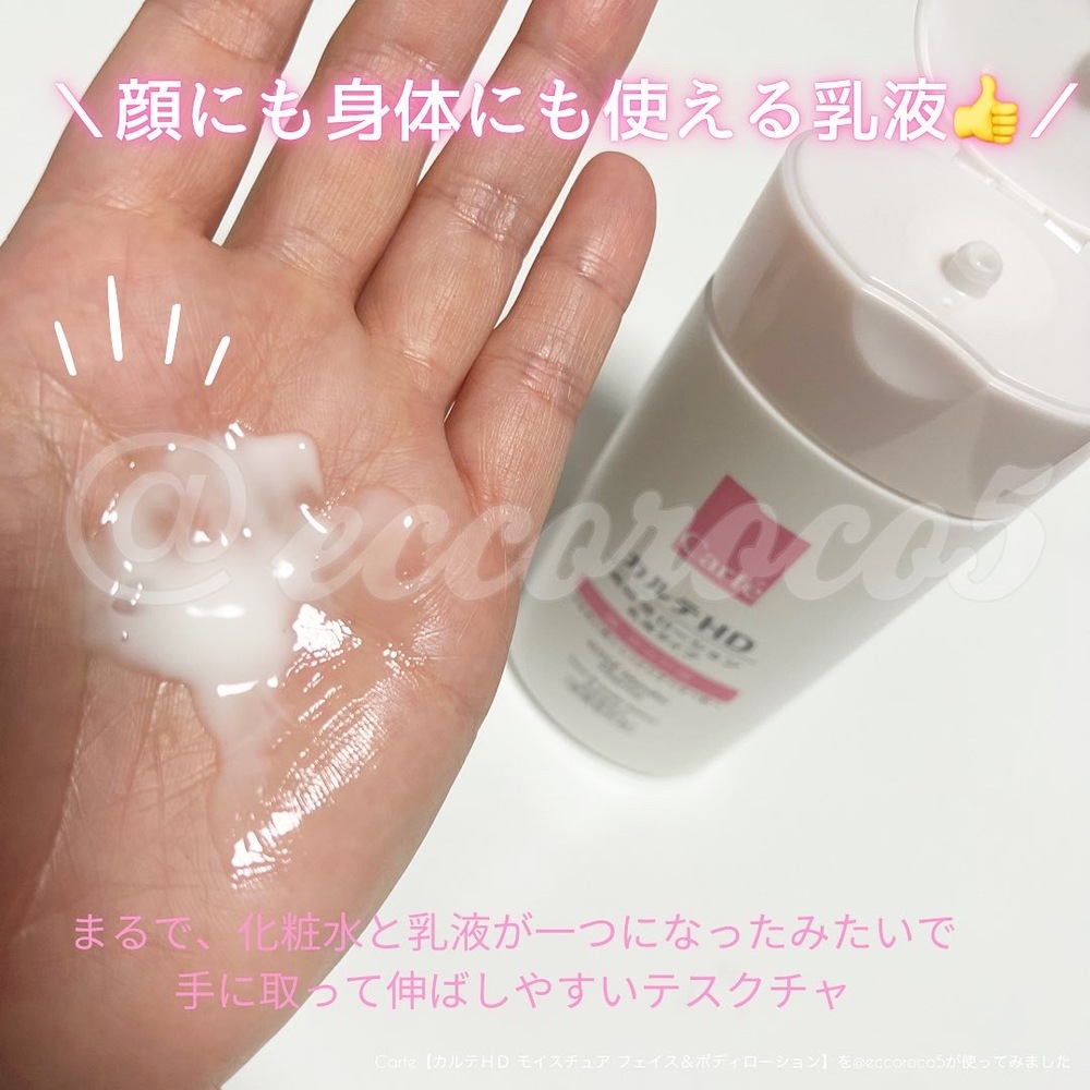 \顔にも身体にも使える乳液👍/ 🙋 Carte【カルテHD モイスチュア フェイス&ボディローション】を@eccoroco5が使ってみました🎈 使用タイプ:ボトル 🎥ここに載せきれなかった写真・使用感の動画は、ブログ@eccoroco5にあり!🎥 ▼ 最近マスクを外して最初にすることは 鏡のチラ見🪞 なぜなら… 口周りがカサカサ乾燥していることが多い...