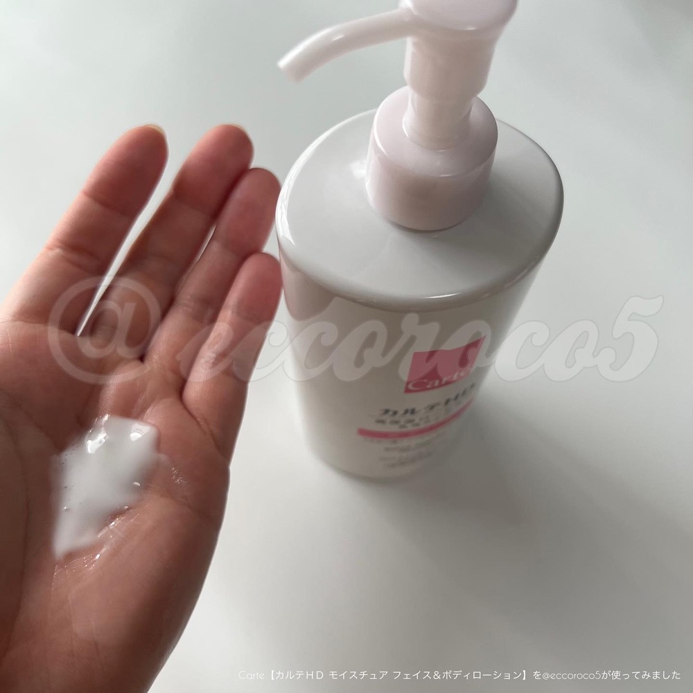 \ワンプッシュでたっぷりポンプ!顔にも身体にも/ \ワンプッシュでたっぷりポンプ!顔にも身体にも/ 乾燥が気になる季節になりましたねぇ。 この時期になると、例年通り口周りがカサカサ。 腕や脚もかゆみを感じます。 だからお風呂上りは全身保湿が必須! 今年はとっても使いやすいポンプタイプで使い心地満足な製品、Carte【カルテHD モイスチュア フェイス&ボディローション】に出会えました★ 【使い心地は…】 ≪テクスチャー&香り≫ とろみがあって、液体というほどゆるくははない乳液タイプのロー...
