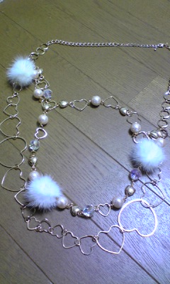 冬用ネックレス、戦利品♪ 白いボンボン?も付いていて冬にピッタリです★ ネックレスも、ハートが繋がっているので、 とっても可愛いんです♪♪ グレーや黒っぽいチェックのワンピースに合わせて さらに可愛さUPを目指す予定です♪ 白いボンボンが、冬らしくて気に入っています。 1900円→1500円でした♪
