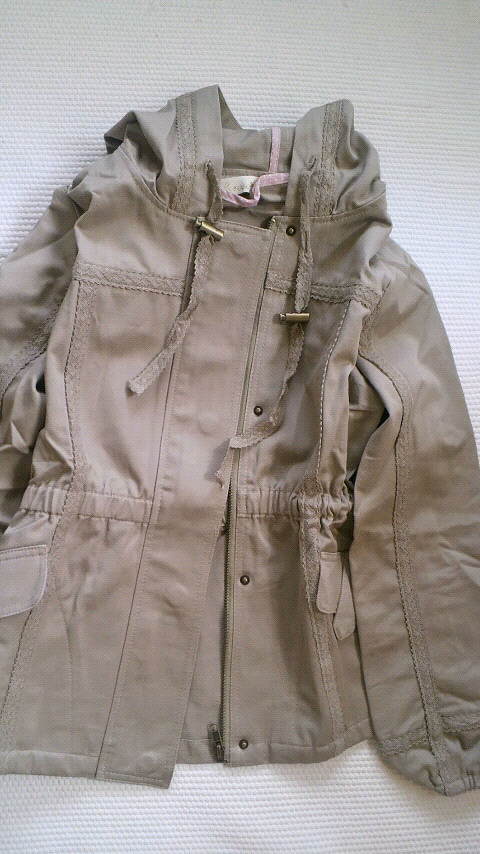 この夏の戦利品は、 beberoseのミリタリーレースワークジャケットです。 発売された時に買おうと思っていたんですが 忘れていて‥SALEになっていたのでやっと買いました。 割引されて5千円くらいで購入出来ましたぁー♪ ウエストが絞ってあったり、フード付き。 シンプルながらレーステープが施されていて可愛いです。