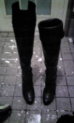 バーゲン戦利品の、ニーハイブーツです。 これまた半額だったので、即買いでした♪ 普段は、折って使っていますが 朝や帰りの寒い時には、ニーハイブーツだと 暖かくて良いです★ 裏が張っていなかったので・・・・ 別に3000円程かかりました;;; でも、雪道で転ばないためには裏張りは必須ですね♪ ※※※暖かすぎて、長時間履いていると膝上まで蒸れ感じがあります※※※