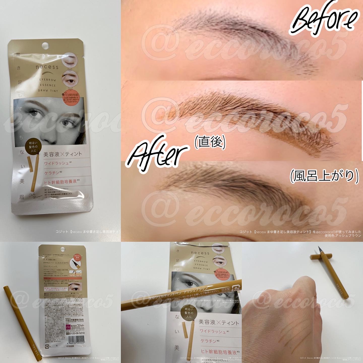 使用色:アッシュブラウン ≪テクスチャー・香り≫ 筆でスッスッと伸ばしやすく、コテコテしていないテクスチャ。 ティントって薬品っぽい香り強かったりすルイメージだけど、こちらはキツイ香りもなく◎ ≪使用感≫ 筆が細めで眉尻も描きやすいところがヒット! これまで何種類も眉ティントを使っているけど、これが一番使いやすい!! 色の持ちもよく、お気に入り! メイク時間の時短&スッピンもこましになれる、心強い味方ですよー!! (ここに載せきれなかった使用感の動画はブログやインスタ、@eccoroco5に投稿...