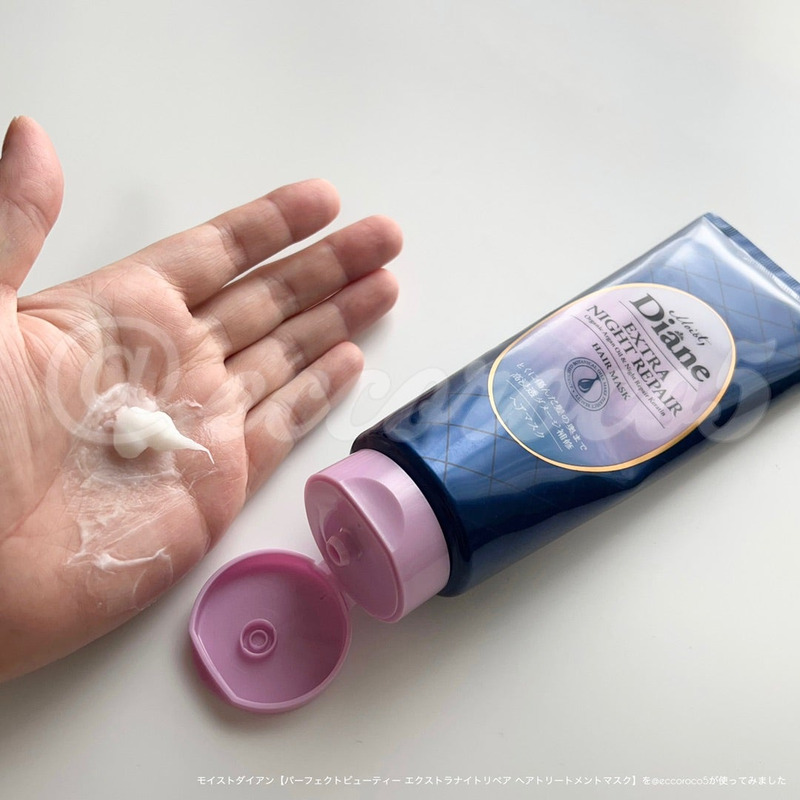 \パサつき落ち着き、手触りスルン❤️/ 【ここがスゴイ!】 数あるモイストダイアンシリーズの中でも、補修成分が同シリーズよりも10倍も配合されているというご褒美ヘアマスク! 【使い心地は…】 ≪テクスチャー&香り≫ 手に出した感じはもったりとして、ちょっとかためな白いクリーム。 元気で華やかなイメージの、しっかり香るベリー系。 ポップシールによると、「ミッドナイトベリーの香り」とのこと。 手に出して直接嗅ぐとベリー系が強いんだけど、髪につけてみると不思議とキャラメルのような香...