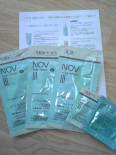 NOV掘.好ンケアのサンプルです。 内容は ・クレンジングクリーム ・ウォッシングクリーム ・フェイスローション (しっとりとさっぱりの2種類) ・バリアコンセントレイト ・モイスチュアクリーム クレンジングとウォッシングは使ってません。 ローション、バリアコンセントレイト、モイスチュアクリーム この3種類を使いました。 NOV兇鮖箸辰燭箸に肌がひりついたので 量を少なめにして使ったのですが・・・ やはりひりついてしまいました。 NOVシリーズはわたしには合わないのかな? 皮膚科へ行くと...