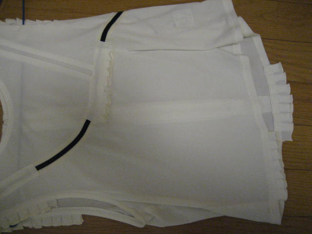 タンクトップですが、秋でもまだ活躍しています。 白のシンプルなタンクトップですが、フリルと切り返しが変わったデザインでポイントになります。 固いデザインのジャケットに合わせると、柔らか女性らしい印象になります。