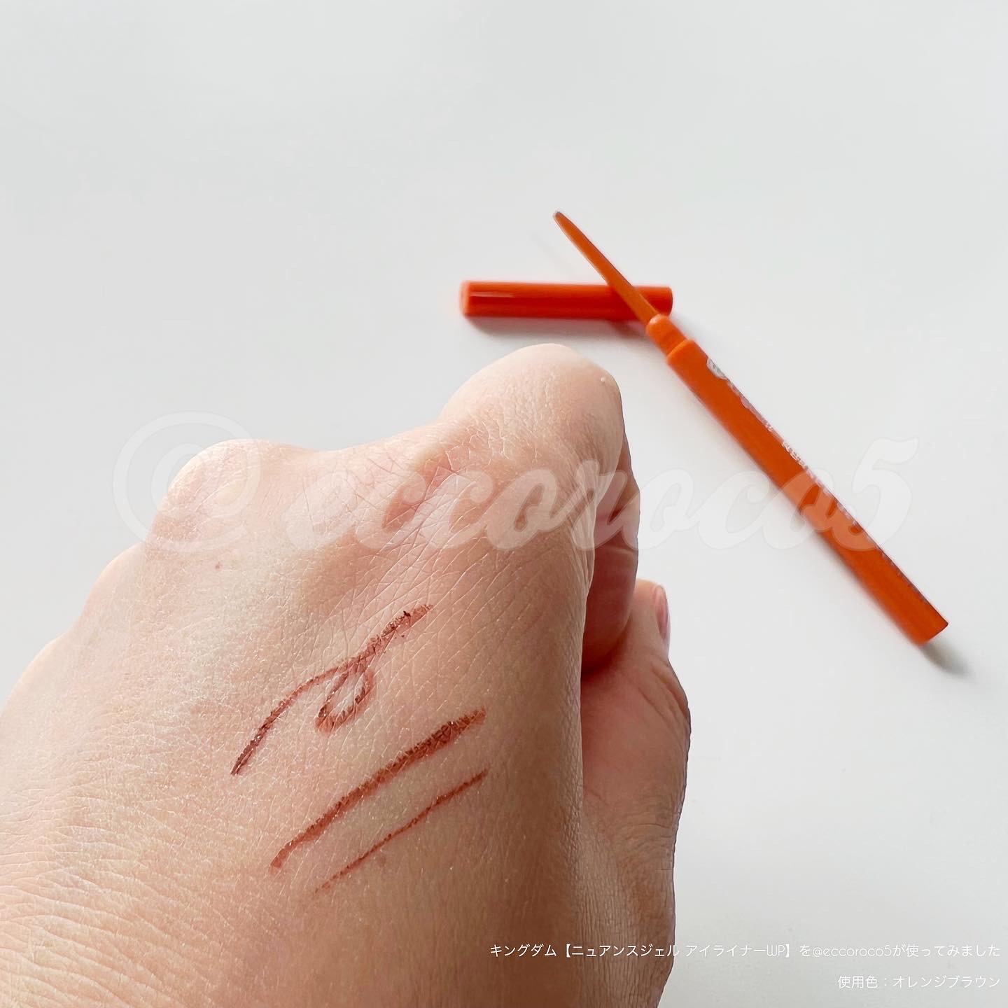 \描きやすい!落ち着いた可愛さのあるオレンジのアイライナー/ 4色あるうちの、ジューシーオレンジでフレッシュな目元になるオレンジブラウンを使用! 【使い心地は…】 ≪テクスチャー≫ 力を入れずにスルスルっとなでるように描くだけでハッキリ発色!このなめらかさ、さすがのジェル。 ≪使用感≫ オレンジが強めの明るめのブラウン。 明るい目元のメイクに一役買ってくれ、まさに春夏にピッタリ!! ブラウンやイエローのアイシャドウとも相性が良いです。 目尻下側のアイライナーとして使うと、ブラウ...