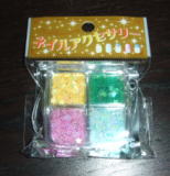 色のグリッターがセットになった100円のネイル用アクセサリーです。4つに仕切られた透明ケースに、黄色、グリーン、ピンク、ブルーの4色のお花の形のグリッターが入っています見ているだけでもかわいい!
