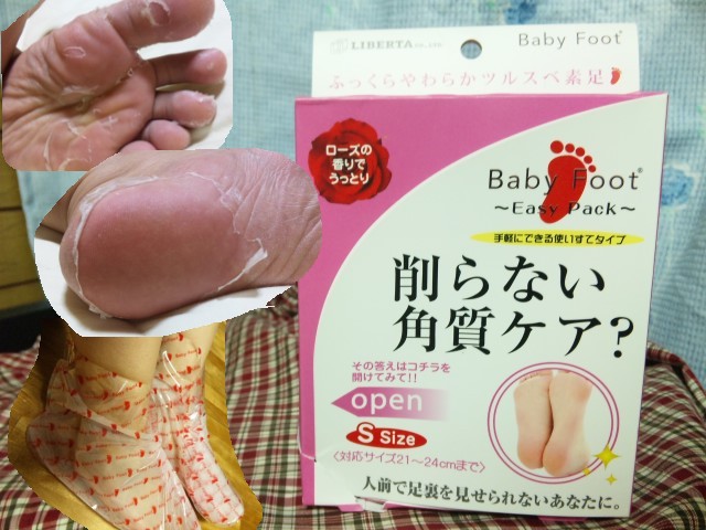 履いて、浸して、洗い流すだけの、足の角質ケア商品。 たっぷりのジェルが浸みてる靴下みたいなのを履いて、そのまま2時間待ちます。 ビニール素材なので液が漏れることもなく、何かをしながら時間を過ごすことができます。 時間が経てば、脱いで洗い流します。 この時点では特に変化はありません。 使用後、約4日〜7日で足裏の古い角質の表面がガサガサポロポロ剥がれてきます。 剥がれにくい場合は、足湯などでふやかすといいですよ♪ 蛇の脱皮のようでびっくりしましたが、剥け終わった足裏はツルツル! これで、足...