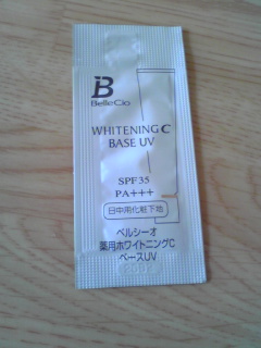 ベルシーオ 薬用ホワイトニングC ベースUVのサンプルです。 色はほんのりクリーム色でした。 使い心地は普通。 可もなく不可もなくって感じですね。