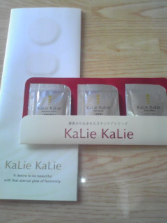 Kalie Kalie サンプル 送料込み100円で購入です(無料じゃないけど)。 内容は 美容化粧水・美容液・クリームが各3回分。 化粧水はとろっとしていて使いやすい。 美容液とクリームも伸びもよく首まで使いました。 塗り終わった瞬間はべたつきが少し感じだけど 翌朝はしっとりしてました。 天然温泉をベースにしているので、肌によさそうです。