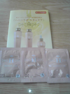 山田養蜂場のハニーラボ スキンケアのサンプルです。 内容は化粧液、乳液、パックの3種類。 サンプルのパウチに使う順番が書かれてあるのでわかりやすいです。 香料がちょっと気になったけど、いやな香りじゃなかったです。 使ってみて、しっとりしました。 パックはお休み前に使うのだけど 翌朝起きた時、しっとりしてました。