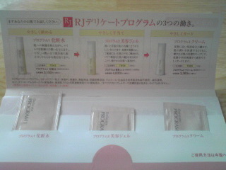 山田養蜂場のRJデリケートプログラムのサンプルです。 敏感で不安定な肌のための、やさしいスキンケア と記載されているように 肌に負担がないように思いました。 化粧水、美容ジェル、クリームの3点ですが 使った感想は肌になじむ感じがしました。 伸びもよかったです。