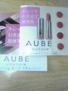 AUBE口紅のサンプルです。 2009年 Springのもの。 リップブラシにとって使用しましたが発色がいいです。 ほんのりとキラキラするのもいいです。 個人的にはナチュラルに見えるBE701がお気に入りです。 普段、口紅は使わないのですが この冬はこのサンプルで春の新色を先取りしてみます。