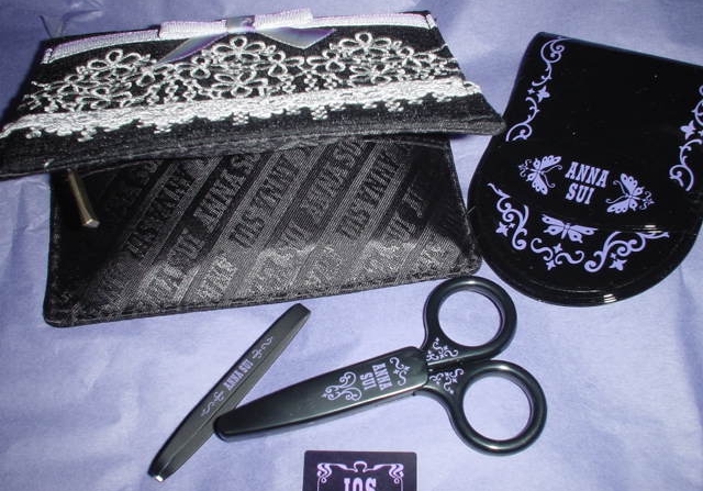 http://www.annasui-cosmetics.com/catalogue/acce/oth.htm 2310円(税込み) ○眉毛カット鋏(サック付き) ○毛抜き(トゥイザーズ) ○ビニールの収納ケース 黒くてかっこいいです! 新しいせいか、まだちょっと挟むのに固いけれど 現在愛用中の毛抜きの次によく抜けます。 先端がもう少し薄ければ最強かもしれません。 この丸さではトゲは抜けないと思います。 鋏は、シャープさ(薄さ)が欲しかったと思います。 厚みがあるし尖っていないので爪の甘皮は切れません。 枝毛切りにはGood! 自宅用ではなく、...
