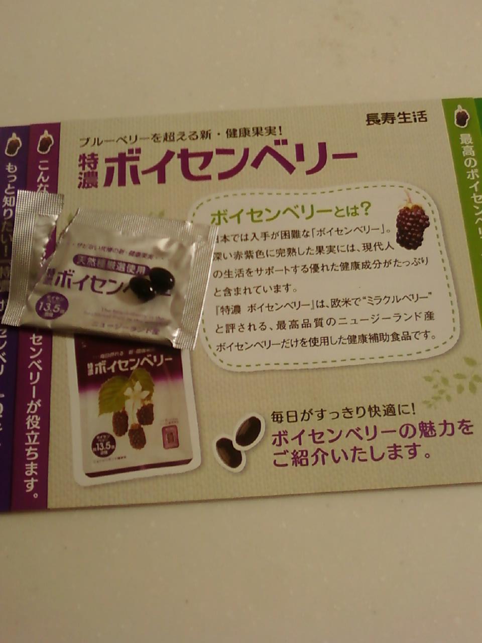 パソコンに夢中に成ってる私は、お疲れ目状態なのでボイセンベリーに飛びつきました!見た目はラズベリーに近い果実でアントシアニン・葉酸他にも成分がタップリ何ですって! 袋を開けるとブルーベリーぽい香りが、中には小さな粒が2つ!取り合えず噛んでみましたが・・・うっすら味が付いた油がジュワ〜っと 美味しいとは言えず、その後噛むのは止めました。 3日間使用しましたが残念ながら私には効果が現れませんでした。